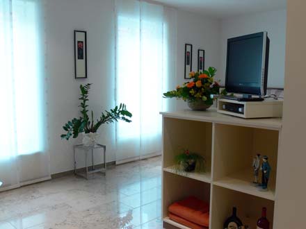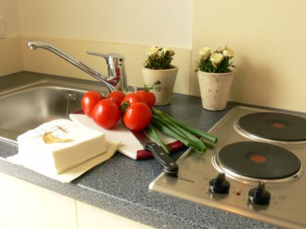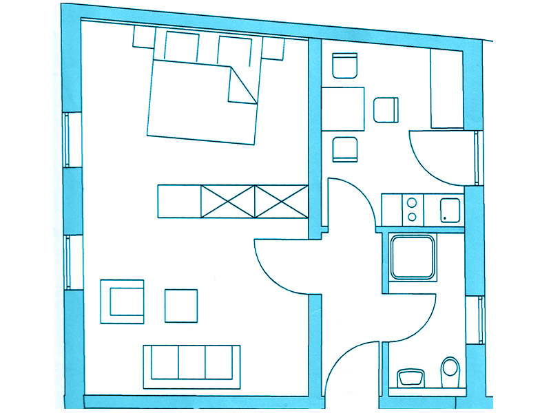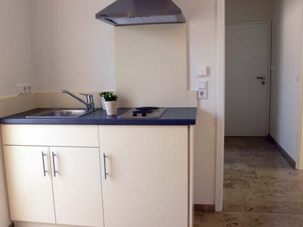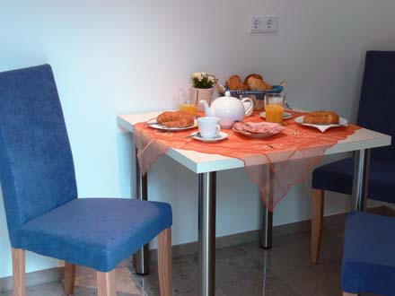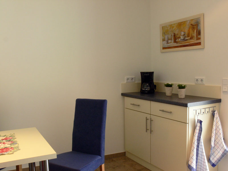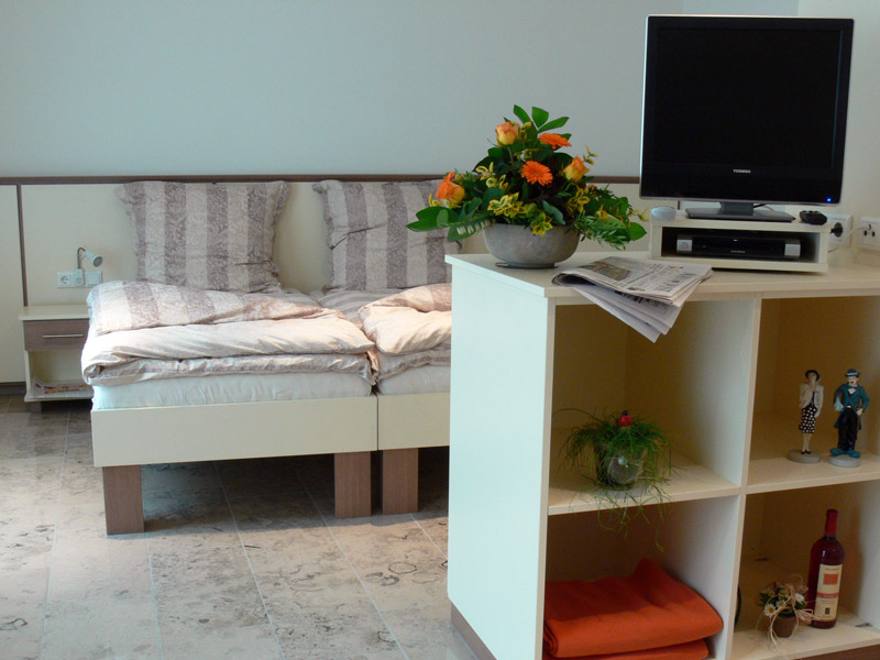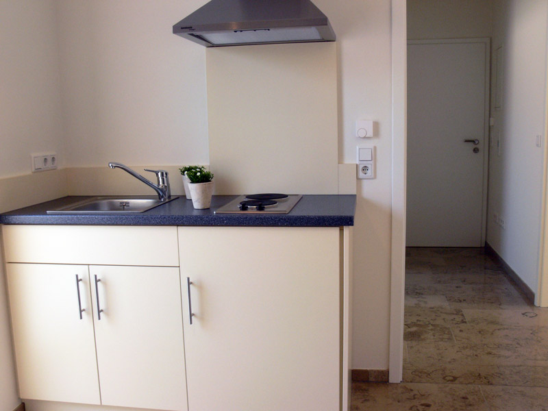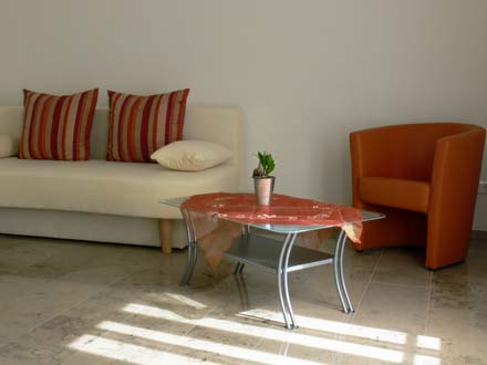 helles, 45 qm großes Apartment, Sitzecke mit Couch, Sessel, Tisch, optisch abgetrennt vom Schlafbereich, separate Küche mit Sitzecke und Zugang zum Balkon, Dusche/WC mit hochwertigen Sanitäreinrichtungen, heller Steinfußboden (Fränkischer Jura) mit Fußbodenheizung.