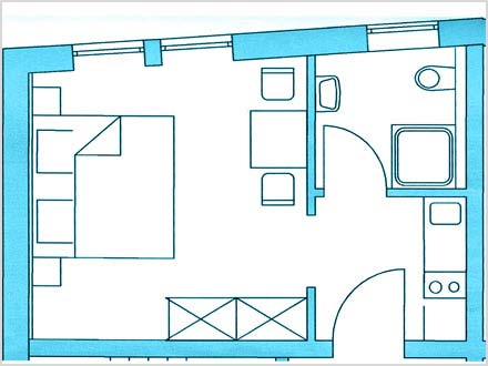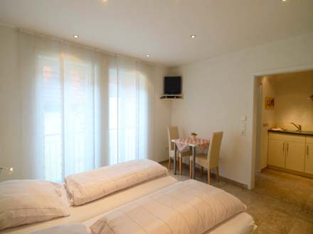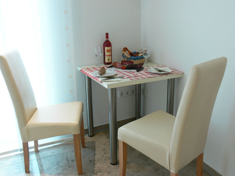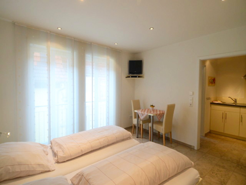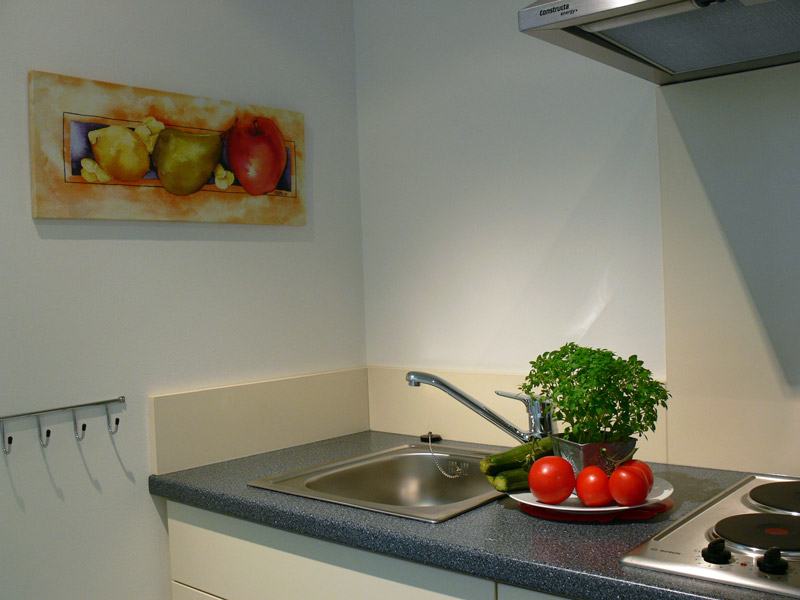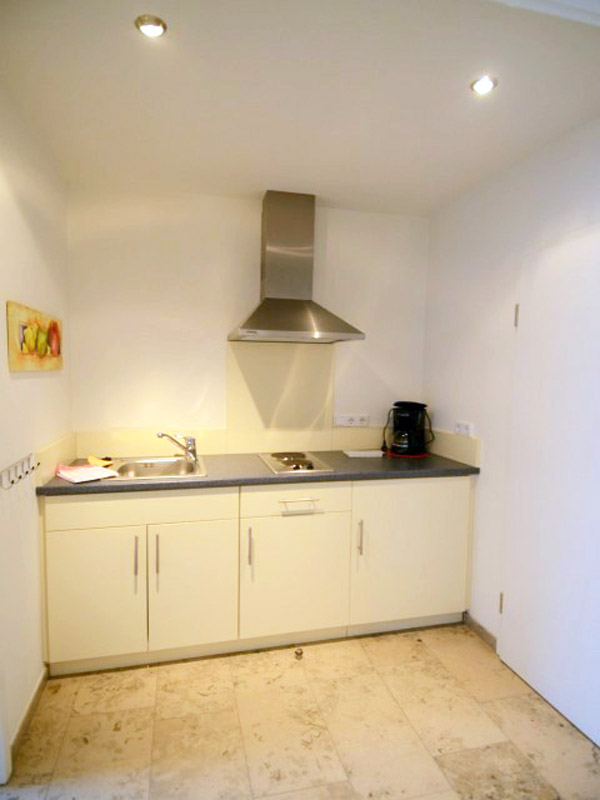 Helles 24 qm großes Ein-Zimmer-Apartment mit separater Kochnische, kleiner Sitzecke, Dusche/WC mit hochwertigen Sanitäreinrichtungen, heller Steinfußboden (Fränkischer Jura) mit Fußbodenheizung.